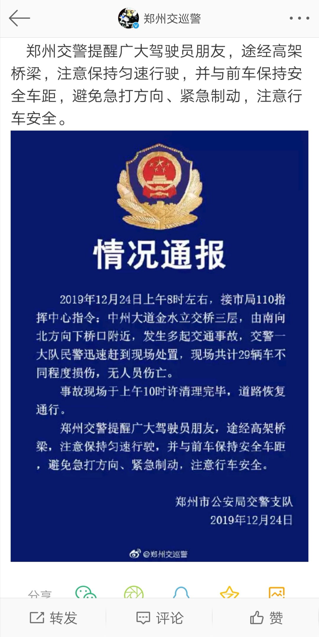 据记者在郑州市公安局官方微博平安郑州看到,12月24日下午2时许,郑州市公安局交警支队发布通告:12月24日上午8时左右,接市局110指挥中心指令:中州大道金水立交桥三层,由南向北方向下桥口附近,发生多起交通事故,交警一大队民警迅速赶到现场处置,现场共计29辆车不同程度损伤,无人员伤亡。事故现场于上午10时许清理完毕,道路恢复通行。