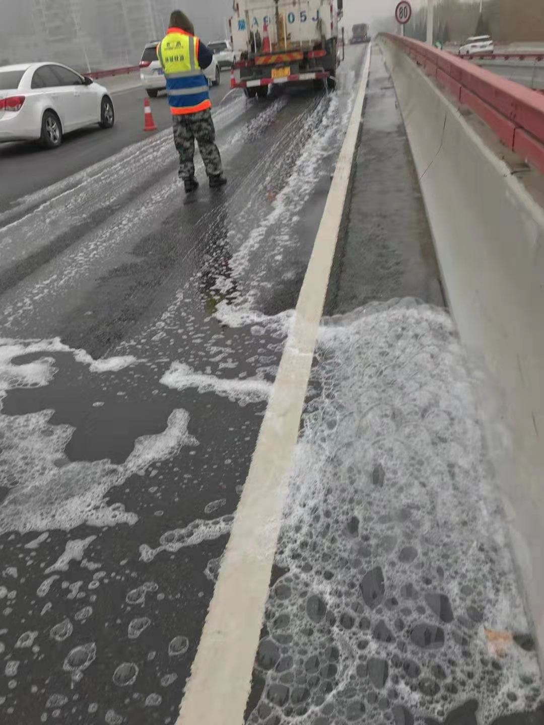 随后,现场环卫工人又调来一辆洒水车,使用了十箱洗洁精进行喷洒,并利用滚轮除雪车进行冲刷,最终才将路面油污全部清理干净。截至上午12时,现场油污处置工作全部完成,道路也全部恢复畅通。