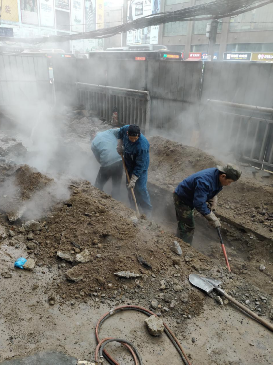 在现场,抢修施工中发现,该处热力管道受污水管道泄露浸泡,腐蚀老化造成破裂。此段管网属于银基支线管网(管径DN250),它已列入2019年老旧管网改造计划,由于道路审批未取得批准,导致施工改造未予以实施。