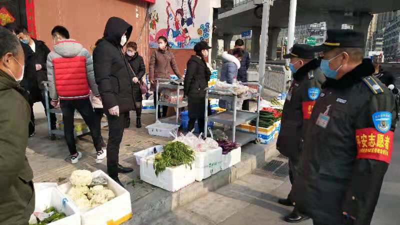1月29日上午10时许,在桐柏路与农业路交叉口附近,一家酒店的十几名员工,正在向市民低价出售蔬菜。有上海青、胡萝卜、蒜苗、西兰花、鲜蘑菇等十余种,此外还有鱼类、肉类和一些加工好的食材。在路上巡逻的中原区桐柏路巡防队员郭保堂、赵留根等人见状,忙过来帮忙维持秩序。