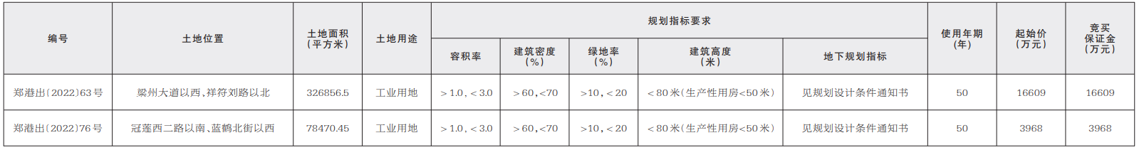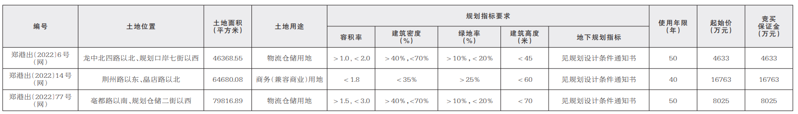 【大河财立方消息】11月26日,中牟县自然资源局、 郑州市自然资源和规划局郑州航空港经济综合实验区分局决定以网上挂牌方式出让郑港出〔2022〕6号(网)等3宗国有建设用地使用权。其中,郑港出〔2022〕14号 (网)为商务(兼容商业)用地,郑港出〔2022〕6号 (网)、郑港出〔2022〕77号 (网)均为物流仓储用地。