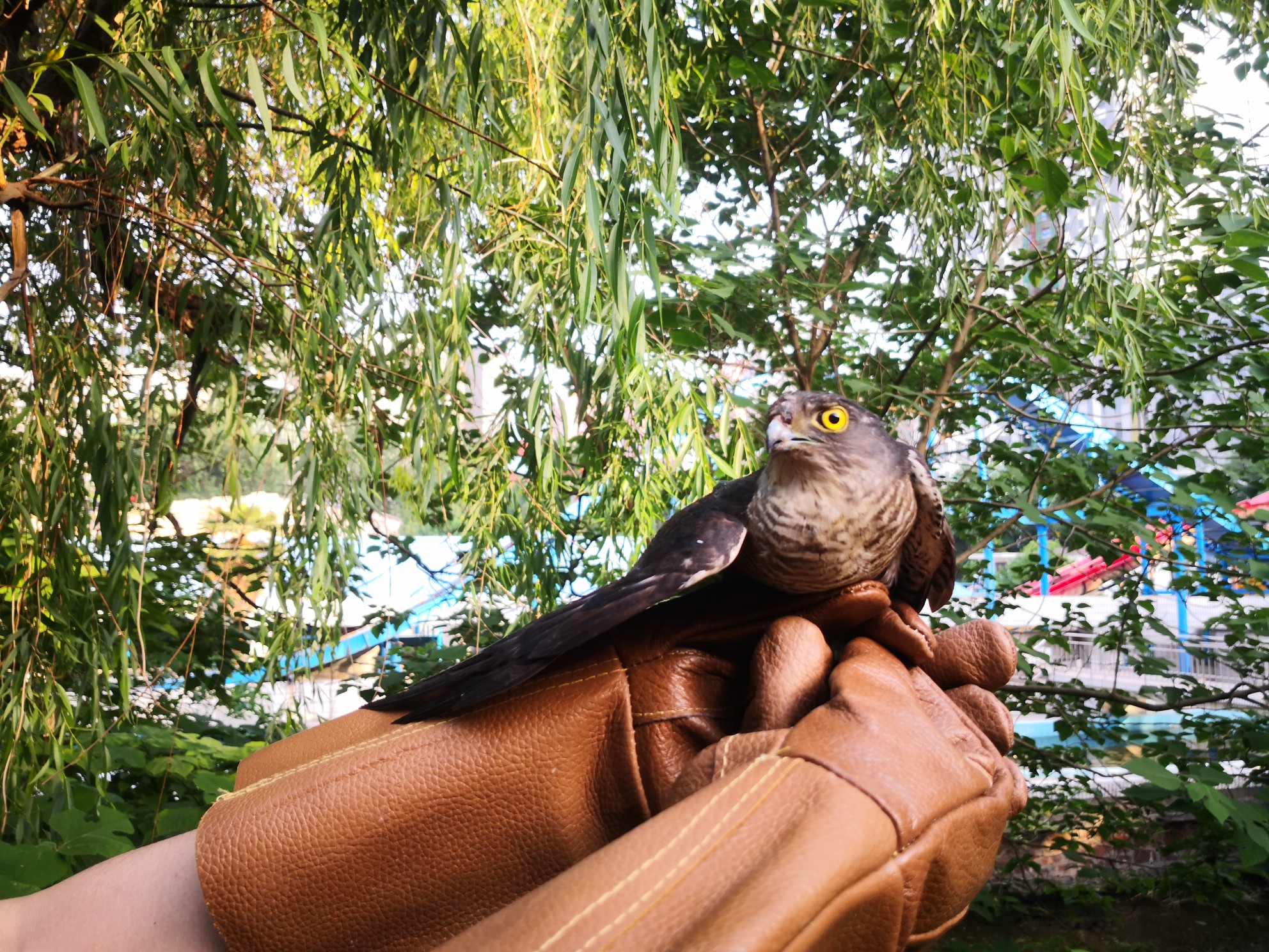 当董朝伟戴着厚厚的防护手套轻轻地捧出红隼和雀鹰时,它们奋力挣扎,不等董朝伟介绍完毕,就挣脱而去,很快就消失不见。