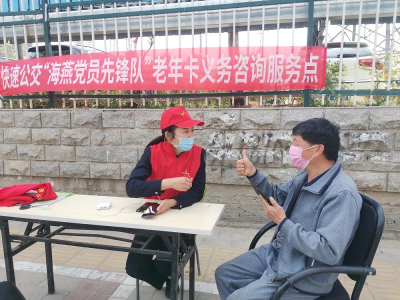 “海燕党员先锋队”的工作台前,前来咨询和办理老年卡审验的乘客络绎不绝,有现场就审验完成的、有回家取卡的。