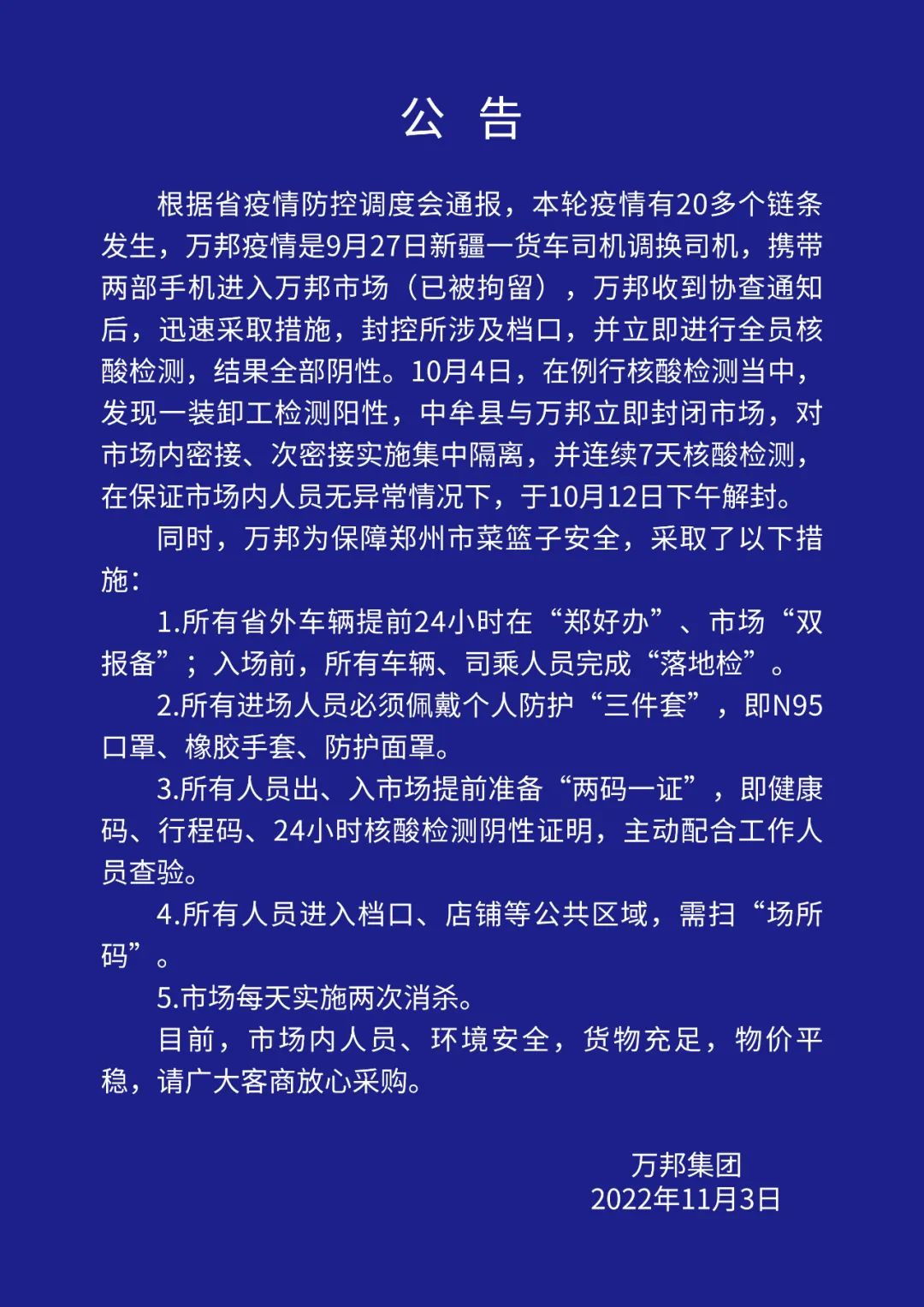 11月3日,万邦集团发布公告,根据省疫情防控调度会通报,本轮疫情有20多个链条发生,万邦疫情是9月27日新疆一货车司机调换司机,携带两部手机进入万邦市场(已被拘留),万邦收到协查通知后,迅速采取措施,封控所涉及档口,并立即进行全员核酸检测,结果全部阴性。