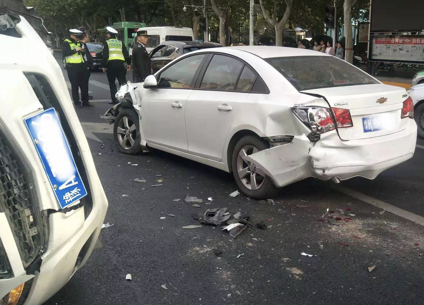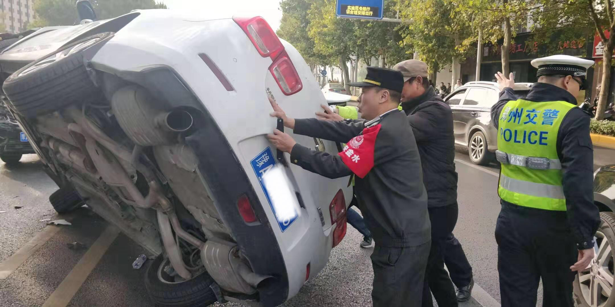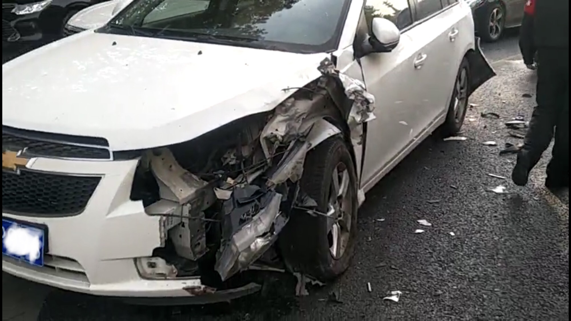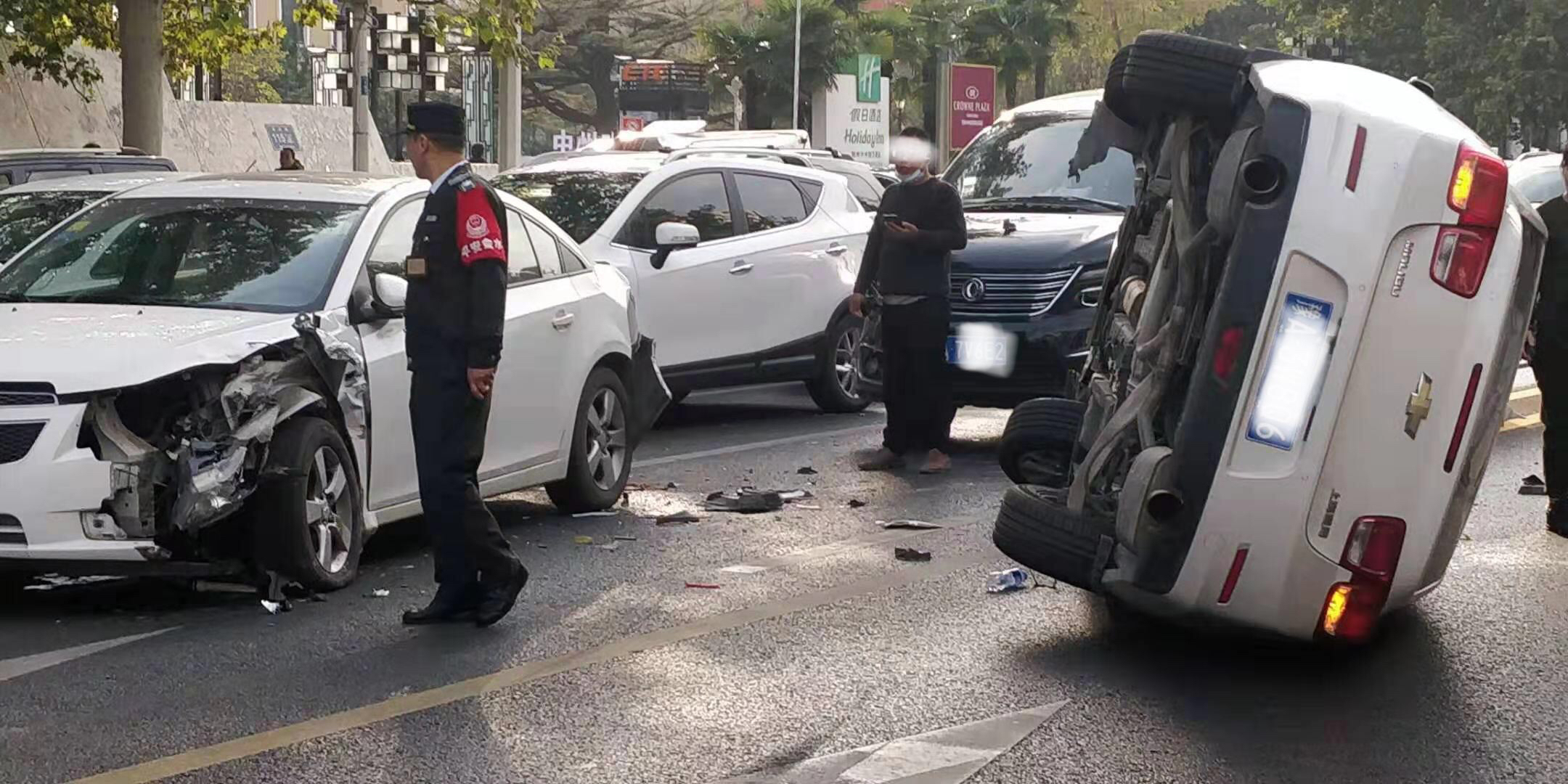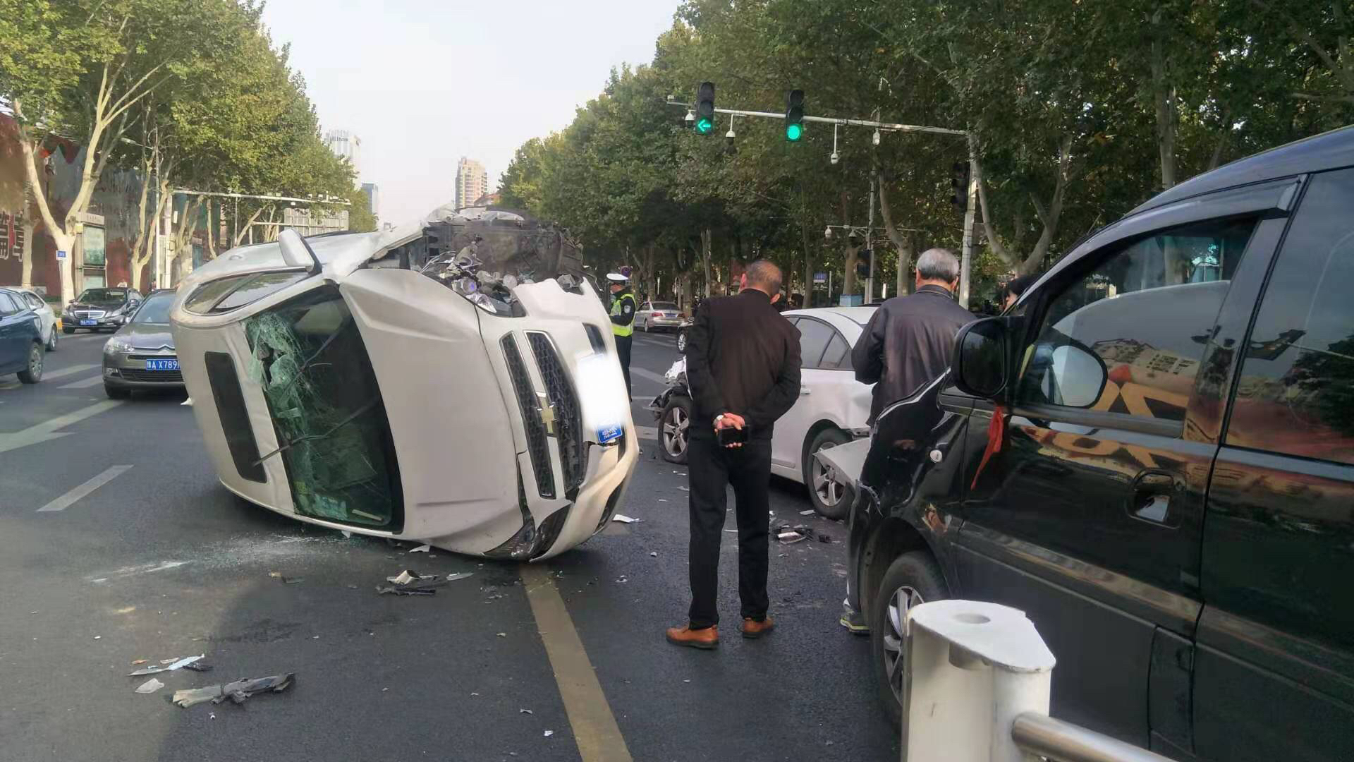 10月25日下午2时30分左右,金水区花园路办事处巡防队员陈玉生、王军建、陈伟海三人,巡逻到金水路与经一路口时,远远听到“咚、咚”几声巨响,寻声赶到事发的金水路与经二路交叉口处,看到现场一片狼藉,地面上到处散落着汽车碎片,一辆挂豫A牌照的白色雪弗莱轿车侧翻在地上,旁边的另一辆挂豫K牌照的白色轿车,车头和车尾都有明显被撞的痕迹。停在两车后面的一辆黑色商务车,车头也有轻微损伤。