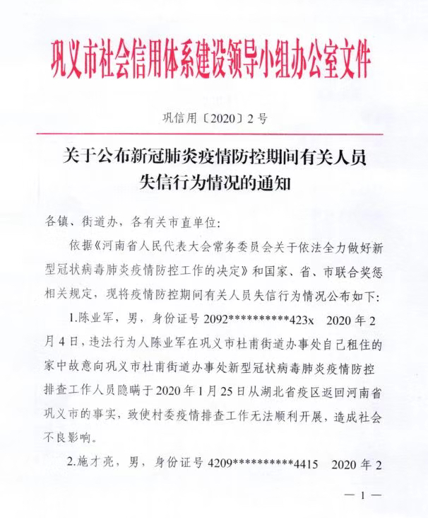 因疫情防控期间存在隐瞒或瞒报情形、逃避医学观察等行为,巩义市有7人被列入失信人名单,成为防疫期间首批失信联合惩戒对象,并记入个人不良信息。2月15日,巩义市社会信用体系建设领导小组办公室发布关于在新型冠状病毒肺炎疫情防控期间将个人隐瞒病史等行为纳入失信监管的公告后公布的第一批失信名单。