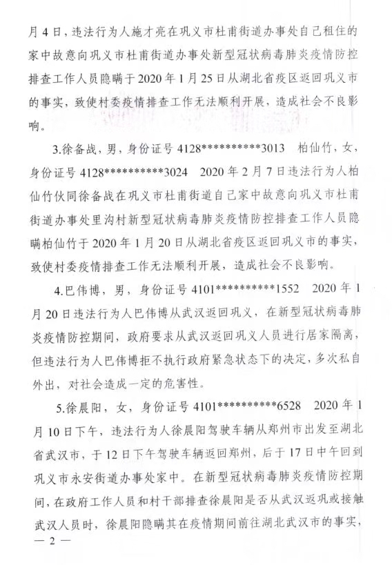 5、徐晨阳,女,2020年1月10日下午,违法行为人徐晨阳驾驶车辆从郑州市出发至湖北省武汉市,于12日下午驾驶车辆返回郑州,后于17日中午回到巩义市永安街道办事处家中。在新冠肺炎疫情防控期间,在政府工作人员和村干部排查徐晨阳是否从武汉返巩或接触武汉人员时,徐晨阳隐瞒其在疫情期间前往湖北武汉的事实,给村中群众造成恐慌,产生不良社会影响。