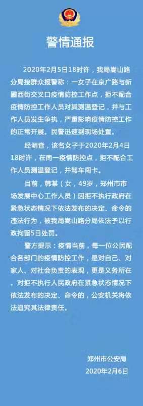 目前,韩某(女,49岁,郑州市市场发展中心工作人员)因拒不执行人民政府在紧急状态情况下依法发布的决定、命令的违法行为,被嵩山路分局依法予以行政拘留5日处罚。