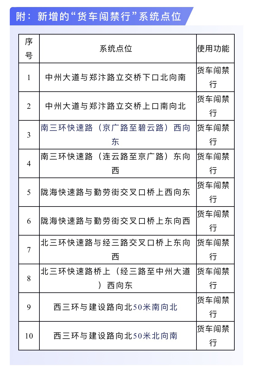 近期,为配合全市交通违法集中整治提升工作,提高科技化管理水平,强化城区道路交通秩序的管理,郑州市公安局交通警察支队在郑州市市区新建了一批“货车闯禁行抓拍系统”,将在2020年8月10日正式投入使用。