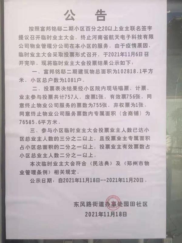 根据园田社区所张贴的投票公告,富邦铭邸二期1081户业主,755户小区业主同意终止物业公司的服务,投票业主占小区总业主的二分之一以上。