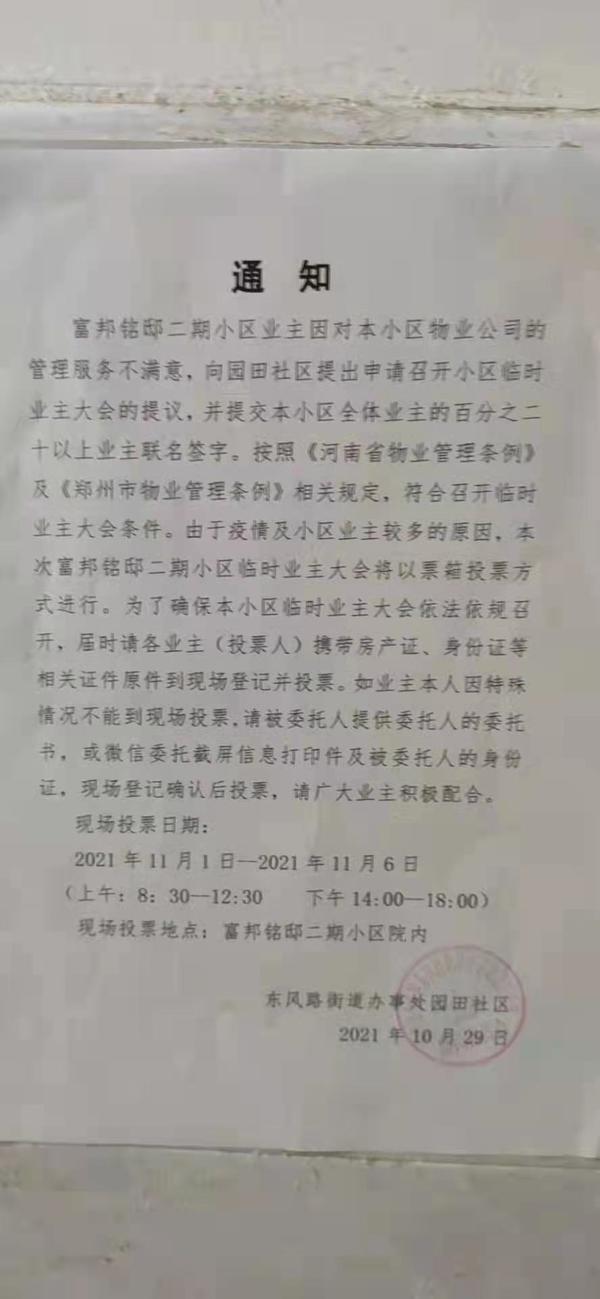 近日,郑州富邦铭邸二期业主反映,业主通过召开临时业主大会,解除了与小区物业的服务关系。但决议通过后,如何下达通知要求物业撤离、何时撤离成为难题。