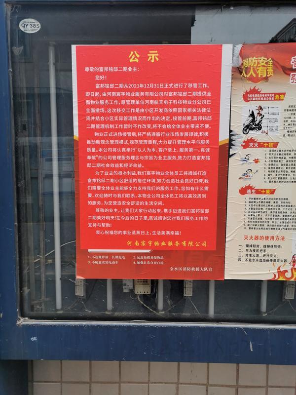 去年10月,郑州富邦铭邸二期业主召开临时业主大会要求解聘原物业公司,经投票表决,解除与原物业公司物业服务协议。