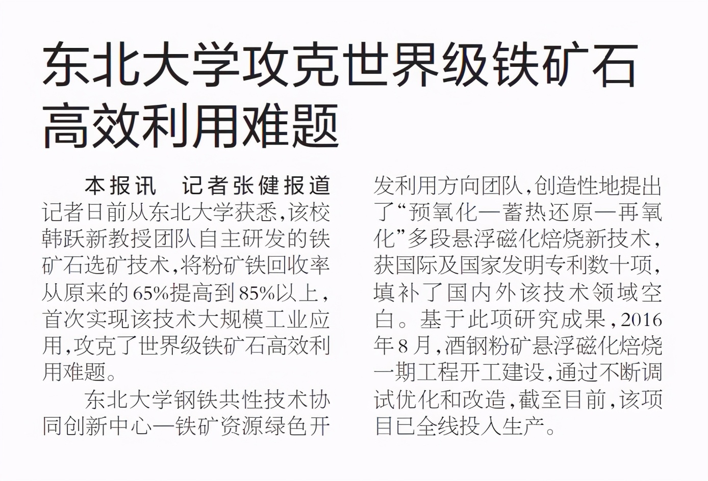 钢铁,工业之粮食,大国之筋骨。铁矿石,钢铁工业的粮食,位于钢铁产业链的起点,是我国重要的矿产资源之一。但我国的铁矿石资源富矿少、贫矿多,且具有贫(品位低)、杂(杂质多)、难(细粒难选)三大特征,国内现在尚有大量未被开发利用的难选铁矿,储量占全部铁矿石的70%以上,我国难选铁矿资源高效利用技术一直亟待攻坚。东北大学韩跃新教授团队自主研发出铁矿石选矿技术,可将粉矿铁回收率从原来的65%提高到85%以上,并首次实现该技术大规模工业应用,攻克了世界级铁矿石高效利用难题,资源利用效率大幅度提高。