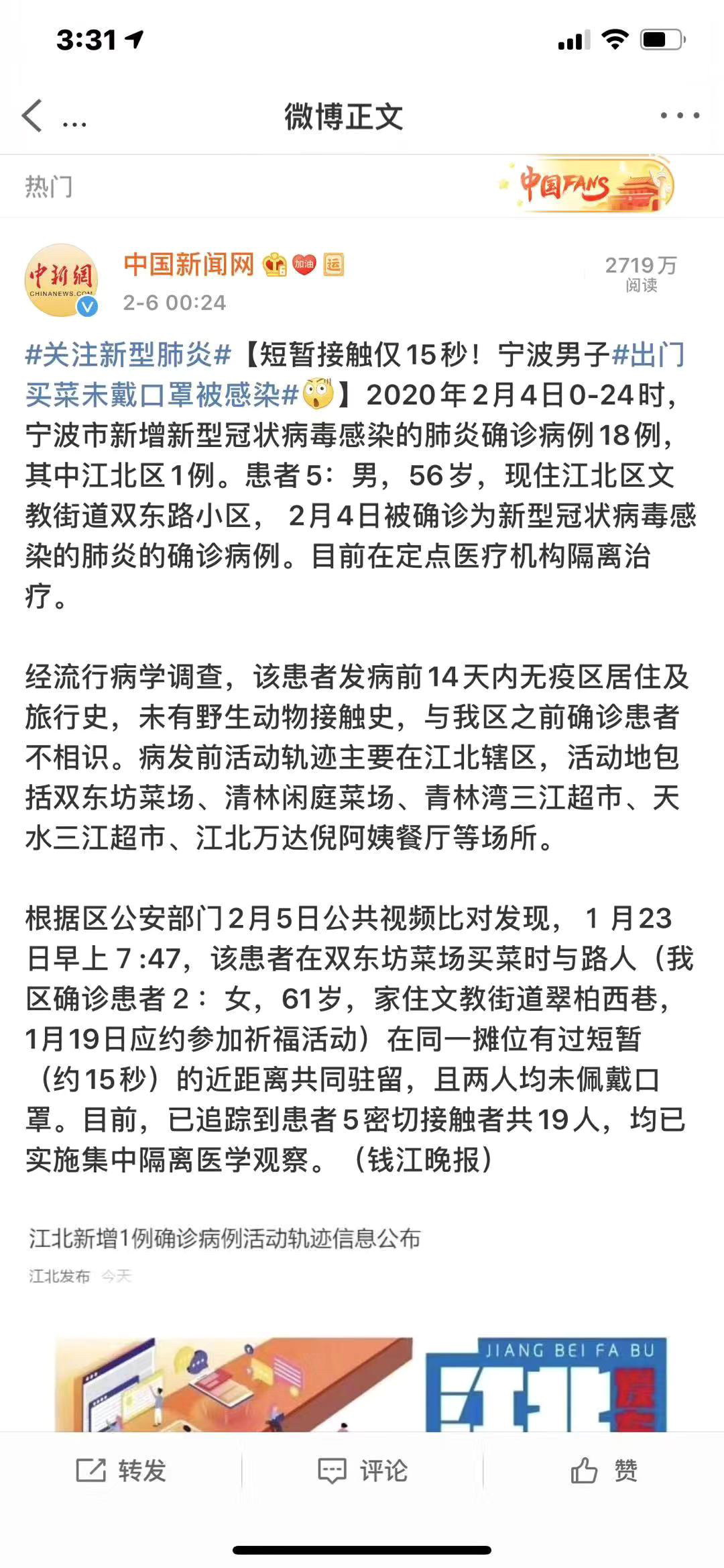 5日,据钱江晚报报道,宁波市江北区一名男子,因为出门买菜没有戴口罩被感染,其中,根据区公安部门2月5日公共视频比对发现,1月23日早7:47,该患者在双东坊菜场买菜时与路人(我区确诊患者2:女,61岁,家住文教街道翠柏西巷,1月19日应约参加祈福活动)在同一摊位有过短暂(约15秒)的近距离共同驻留,且两人均未佩戴口罩。