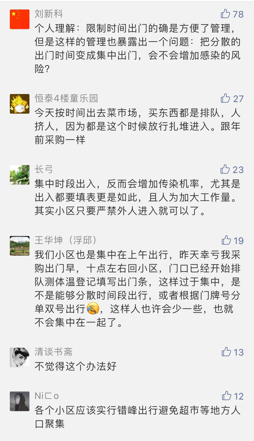 对此,不少网友建议,小区加强管理、把疫情阻挡在门外是好事,但做法可以更加科学。比如分开时段,“错峰出行”。也有网友戏称:可以根据门牌号“单双号”出行,上午单号出去,下午双号出去。