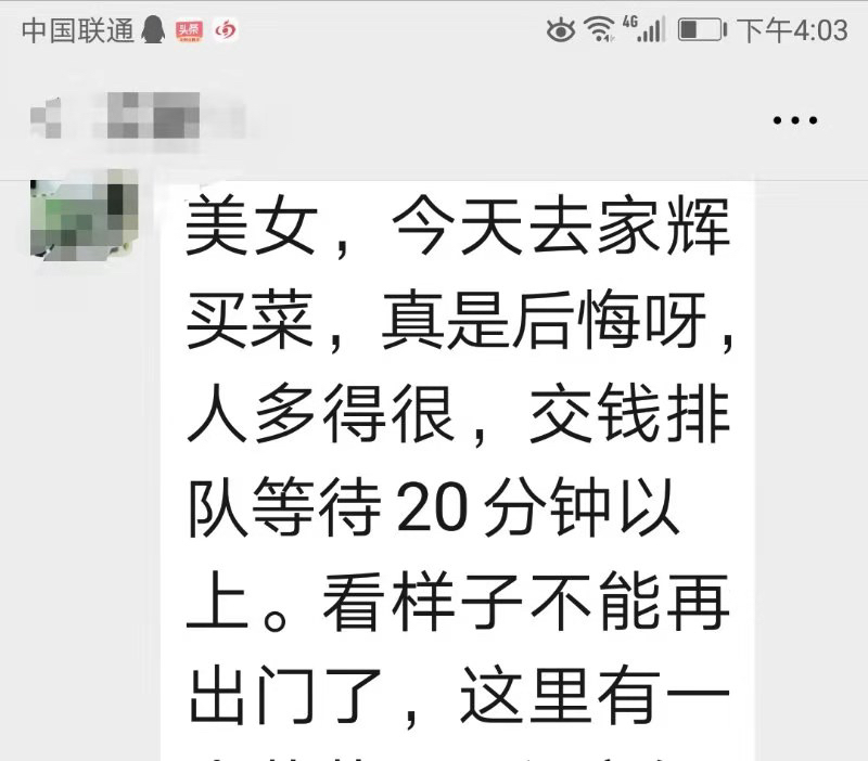 “今天去家辉买菜,真是后悔呀,人多得很,交钱排队等待20分钟以上。看样子不能再出门了。”5日下午,记者收到了一位朋友发