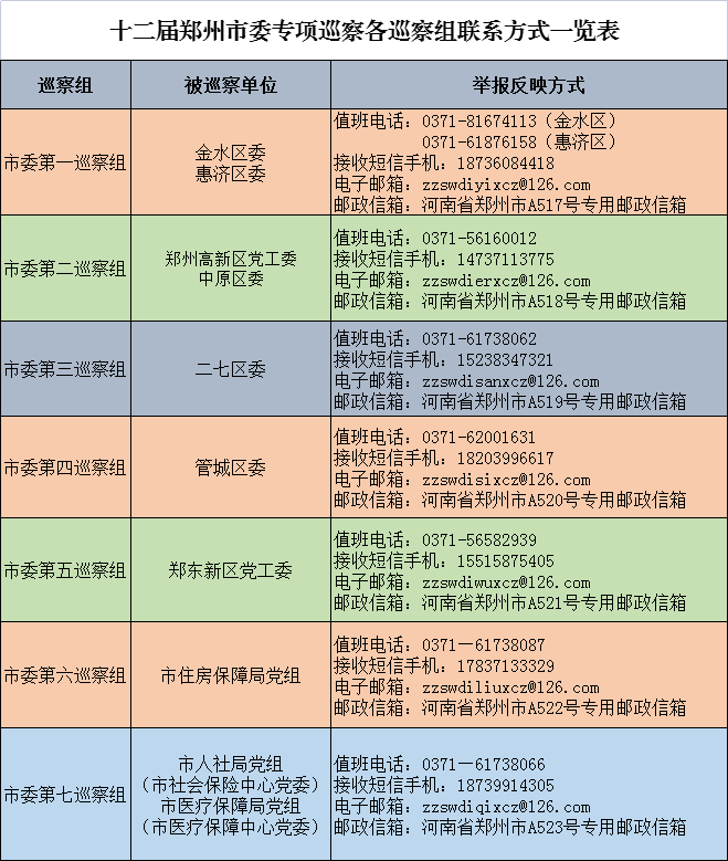 8月30日至31日,十二届郑州市委7个巡察组已按照市委统一部署全部进驻,对郑东新区党工委、郑州高新区党工委、中原区委、二七区委、金水区委、管城区委、惠济区委、市住房保障局党组开展安置房建设和问题楼盘攻坚化解工作专项巡察,对市人社局党组(市社会保险中心党委)、市医疗保障局党组(市医疗保障中心党委)开展社保基金管理问题专项巡察。