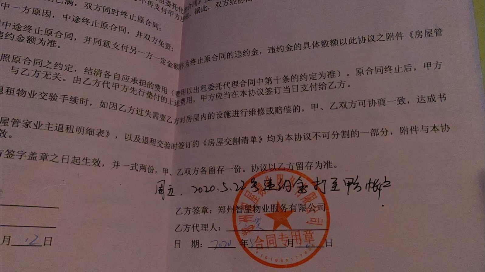 她介绍,前几年,和中介托管郑州智屋物业服务有限公司(以下简称“智屋公司”)签订的合同,去年11月份,已是第三年签合同,之前两年都没啥事,结果,今年4月20号左右,智屋公司打电话称因为疫情原因,房子不好租,说不续约了,要毁约。刚交了40天的管理费,目前合同还未到期,这可咋办?是他们违约。