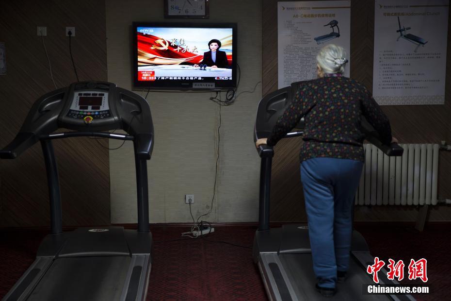 10月22日,一位老人在河北廊坊燕达国际健康城健身,旁边的电视上正播放十九大相关内容。当日,参加十九大新闻中心组织的以“京津冀协同发展”为主题的参观采访活动的中外记者,赴河北省廊坊市香河县、大厂县、三河市实地了解当地近期发展变化和在京津冀协同发展中发挥的作用。中新社记者 刘关关 摄