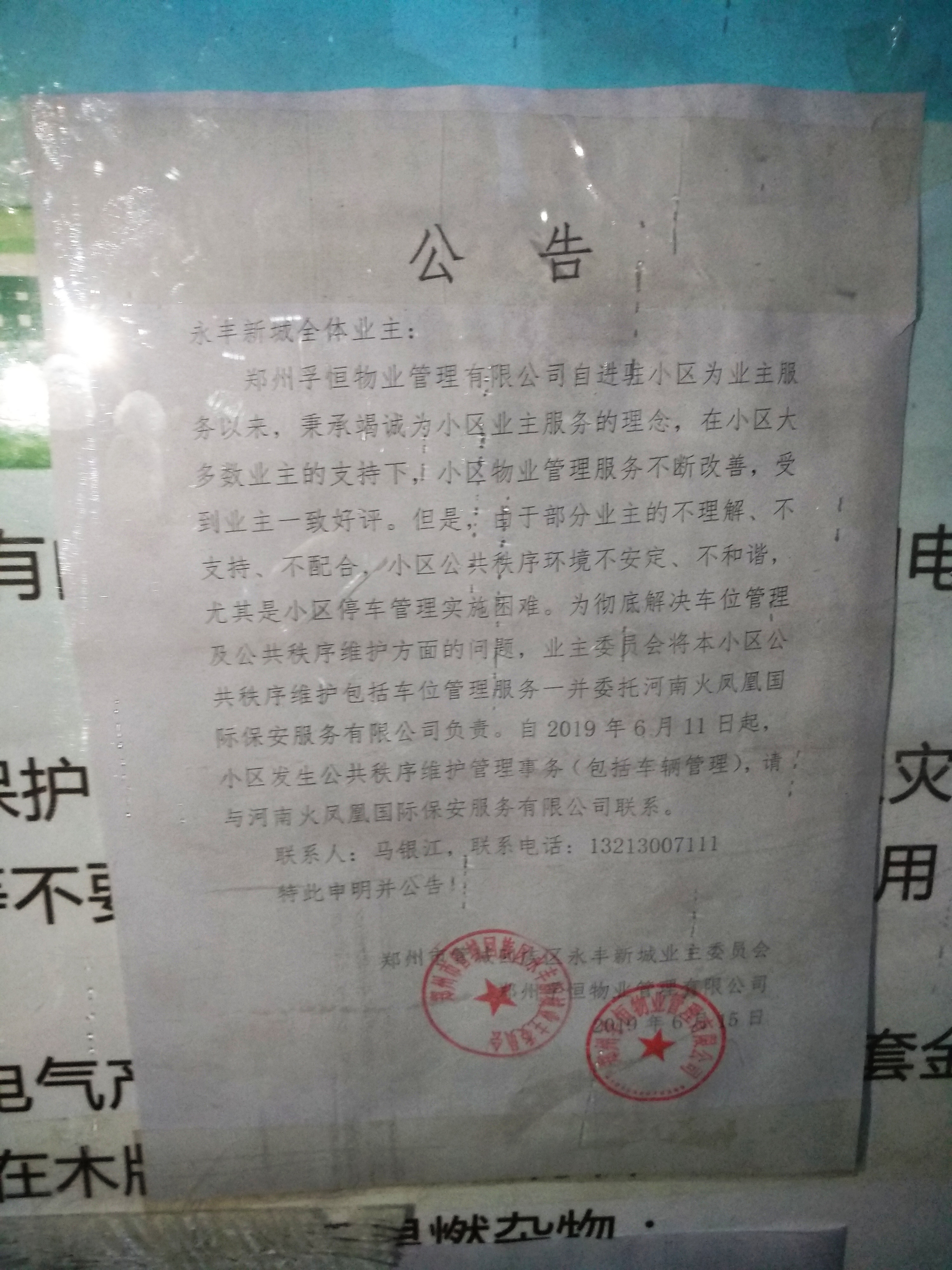 业主们讲,6月15日,永丰新城业主委员会在小区内公告栏张贴了一份公告。该公告说,为彻底解决小区车位管理及公共秩序维护,业委会将小区公共秩序维护包括车位管理服务一并委托河南火凤凰国际保安服务有限公司负责。此前,原负责该小区物业服务的河南乐邦物业管理有限公司也被业主委员会解聘,而换为郑州孚恒物业管理有限公司。