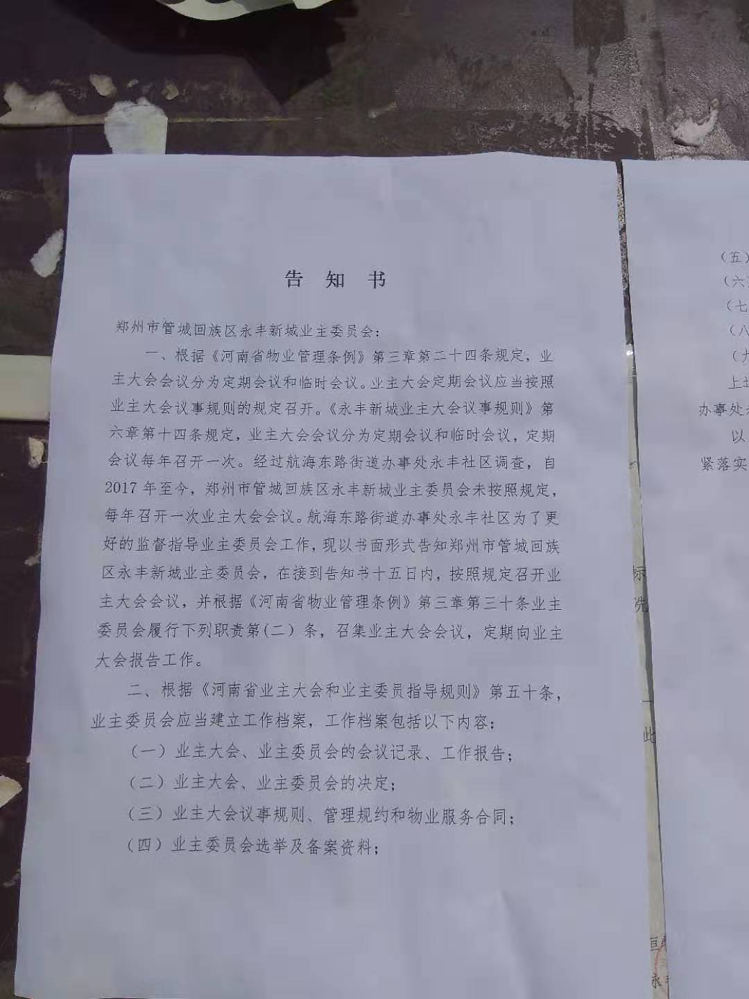 7月24日,郑州市管城区航海东路办事处永丰社区居委会发布公告,以书面形式告知永丰新城业委会,在接到告知书15日内,按照规定召开业主大会会议,并根据《河南省物业管理条例》相关规定,向业主大会报告工作,并向小区相关账目公示并上报。