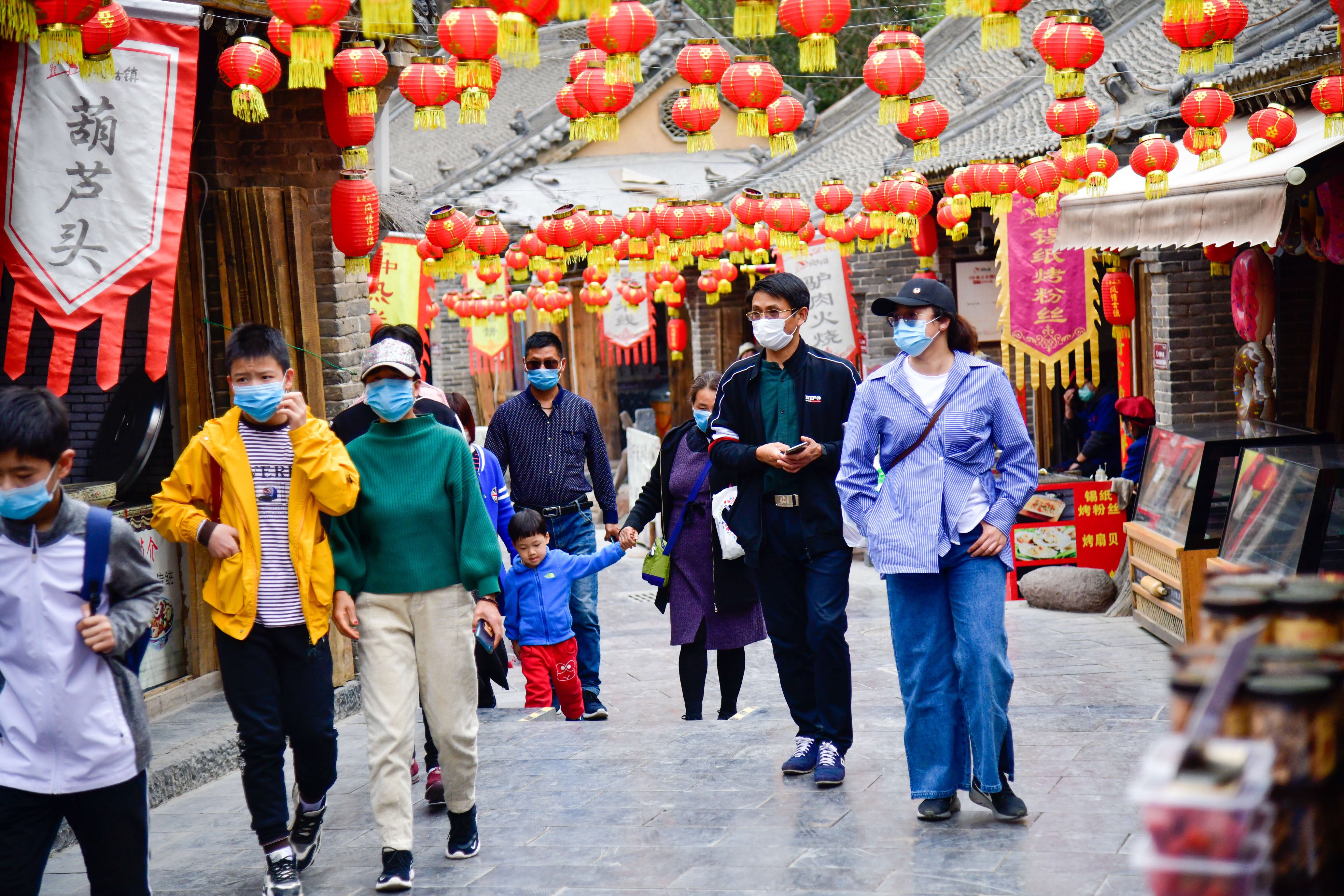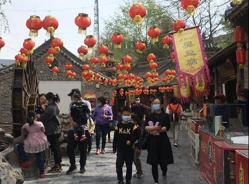 上午9点,记者在康百万庄园景区看到,游客们戴着口罩,正有序地排队登记、购票、扫码、测温,准备进入景区参观。园内,有专人对公共区域喷撒消毒液。