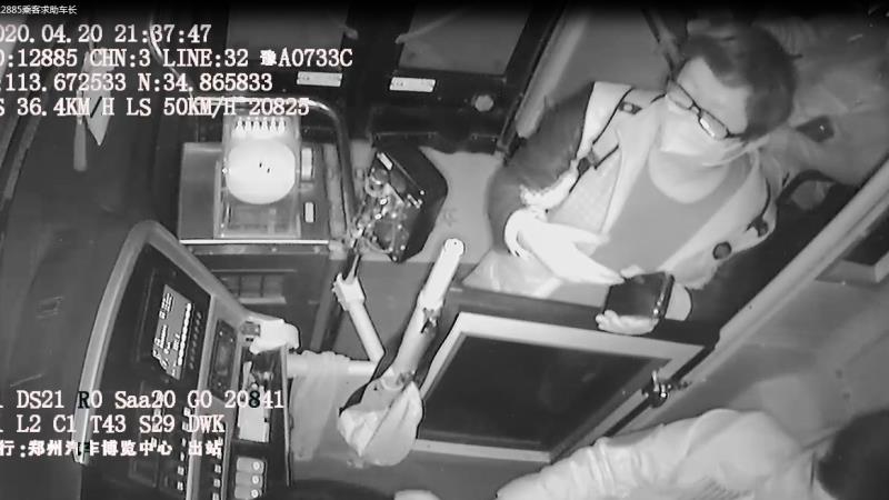 4月20日晚9点36分,郑州公交32路车长黄尚彬驾驶车辆行驶到汽车博览中心站时,车内一名中年乘客走到黄尚彬身边,慌张地询问黄尚彬是否还有返程车辆。