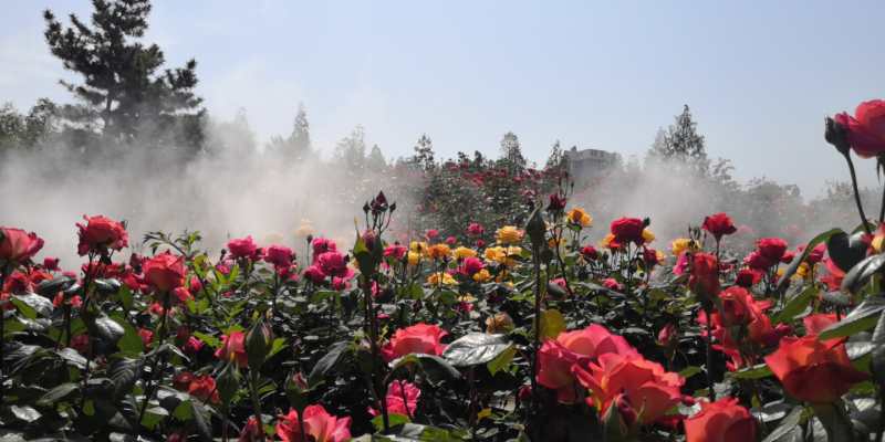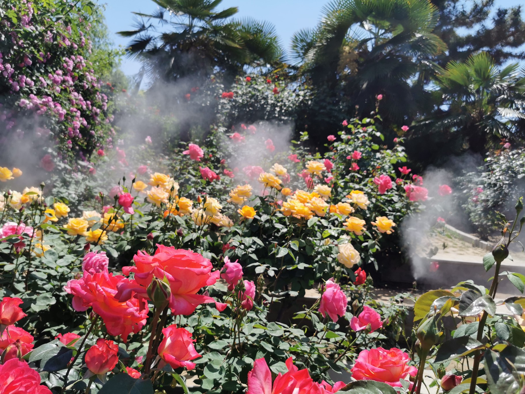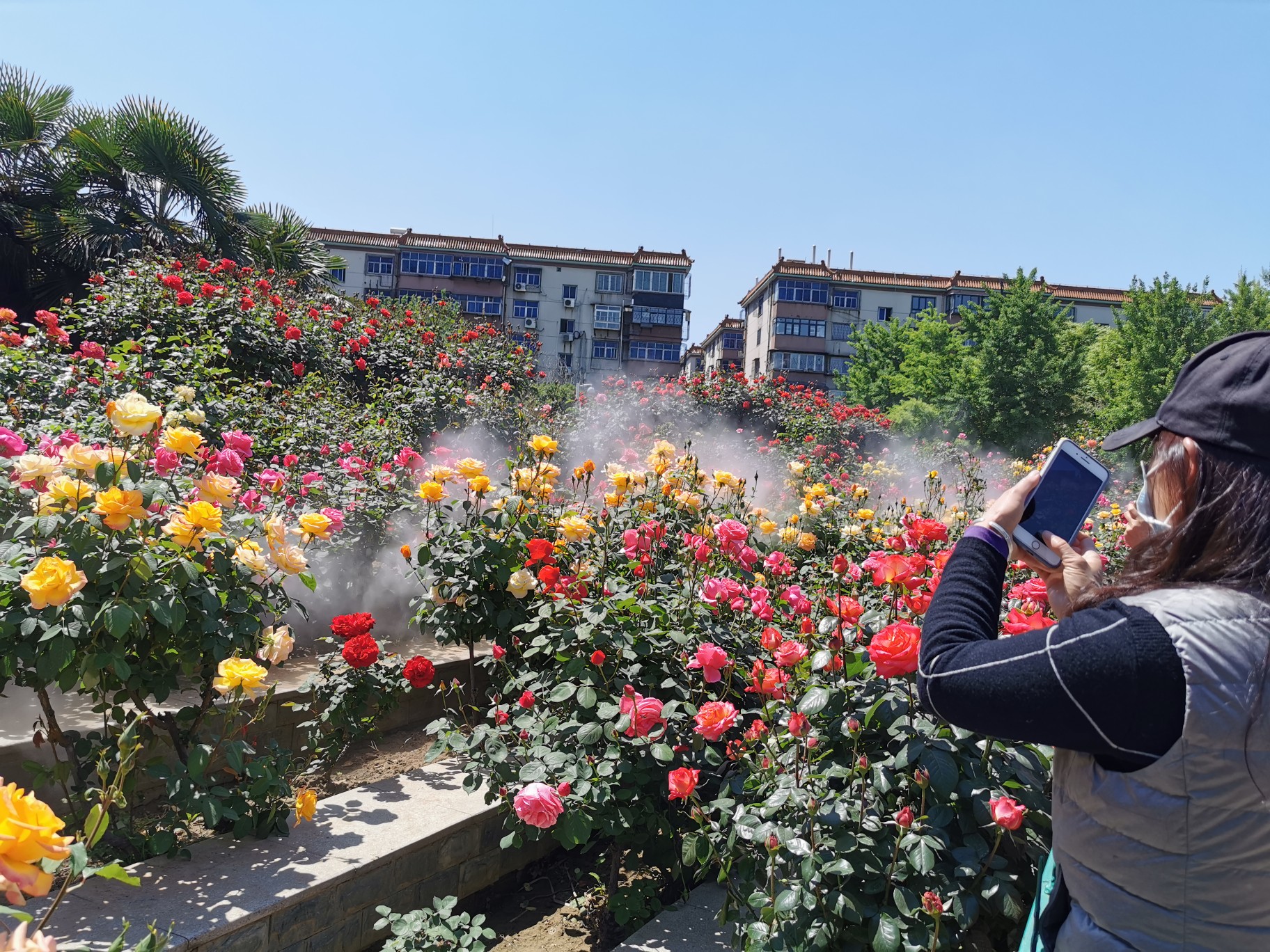 月季花株下,设置的雾森系统开启,密集的小水珠从地面,升腾而起,团团雾状小水珠在花丛、枝叶间漂浮、摆动,吸引了小朋友连连感叹:“哇噢,像仙境一样美。”端详着花儿的美,雾森小水珠的妙,不少市民凑到近前,站在月季花围栏外,手举相机一阵猛拍。