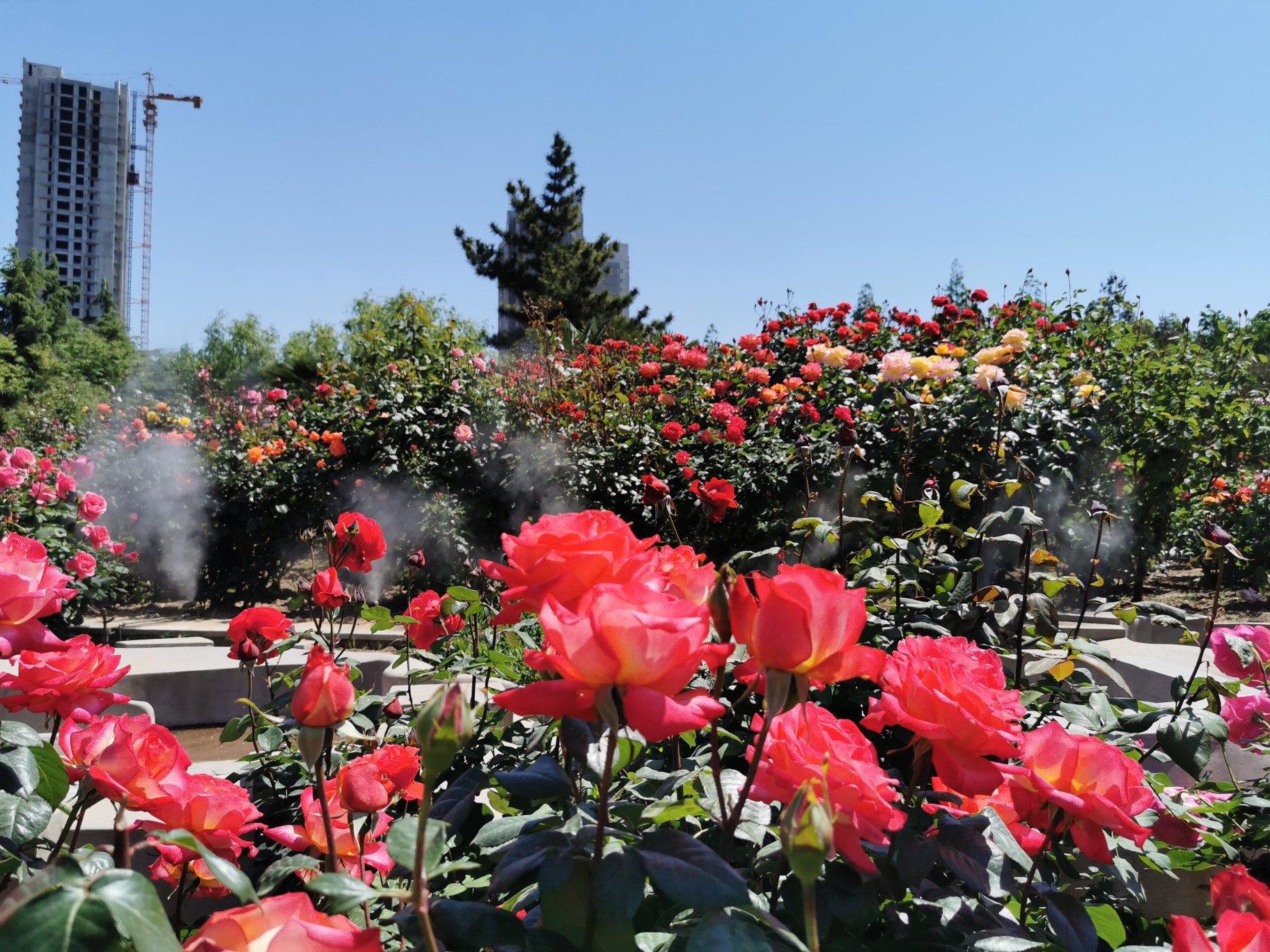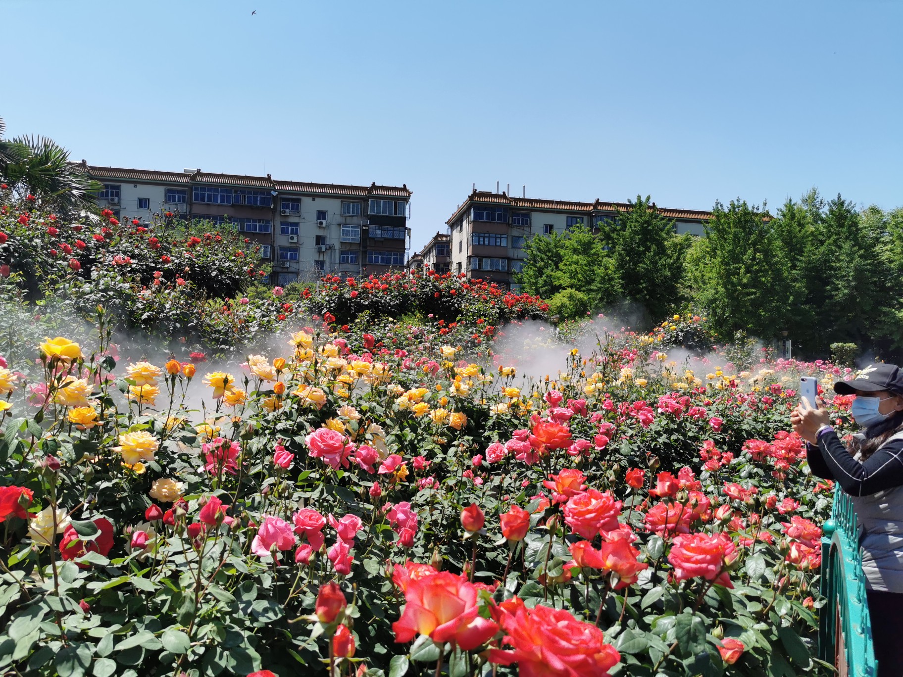 “花落花开无间断,春来春去不相关。”经过漫长寒冬的“蛰伏”,最近几日,郑州市月季公园内吐绿发芽数日的月季,迎来了花开大“爆发”。红的、黄的、白的、粉红的……1200多种月季竞相斗艳,它们一团团、一簇簇比着盛开,在蓝天映衬下,架设期间的雾森系统喷淋着小水珠,宛如人间仙境。