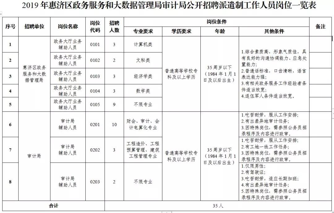 本次公开招聘共设置8个岗位,计划招聘工作人员35名。招聘岗位、人数、资格条件等要求详见《2019年惠济区政务服务和大数据管理局审计局公开招聘派遣制工作人员岗位一览表》。