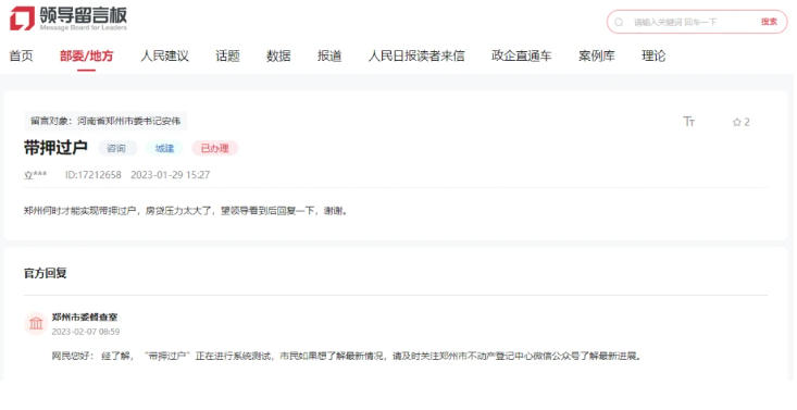 【大河财立方 记者 朱娟】近日,有郑州市民在人民网领导留言板咨询,郑州何时才能实现“带押过户”,房贷压力太大了。对此,郑州市委督查室回复称,经了解,“带押过户”正在进行系统测试。