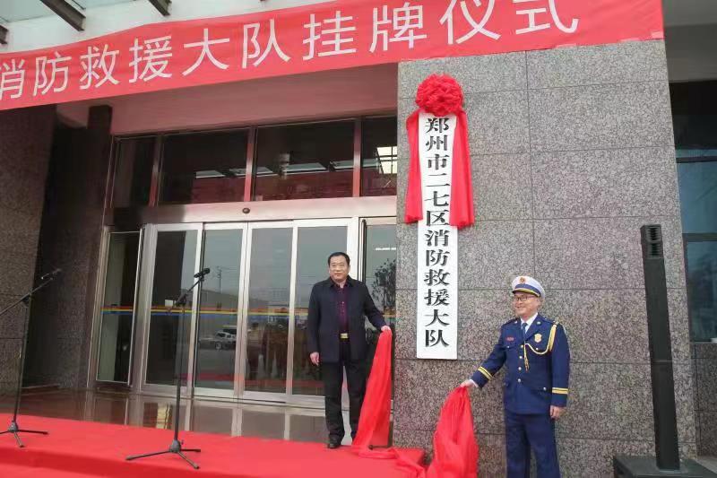最后,二七区副区长胡新生和二七区消防救援大队大队长李庆虎共同为“二七区消防救援大队”揭牌。