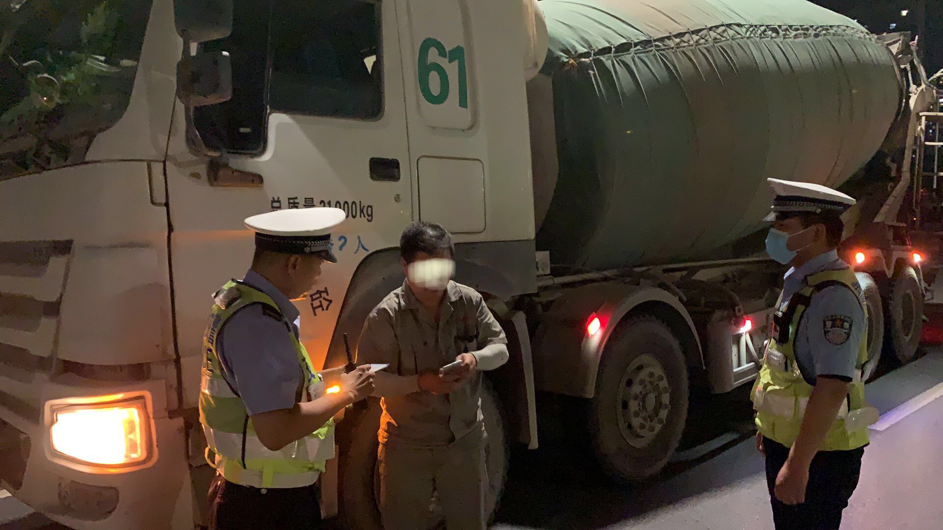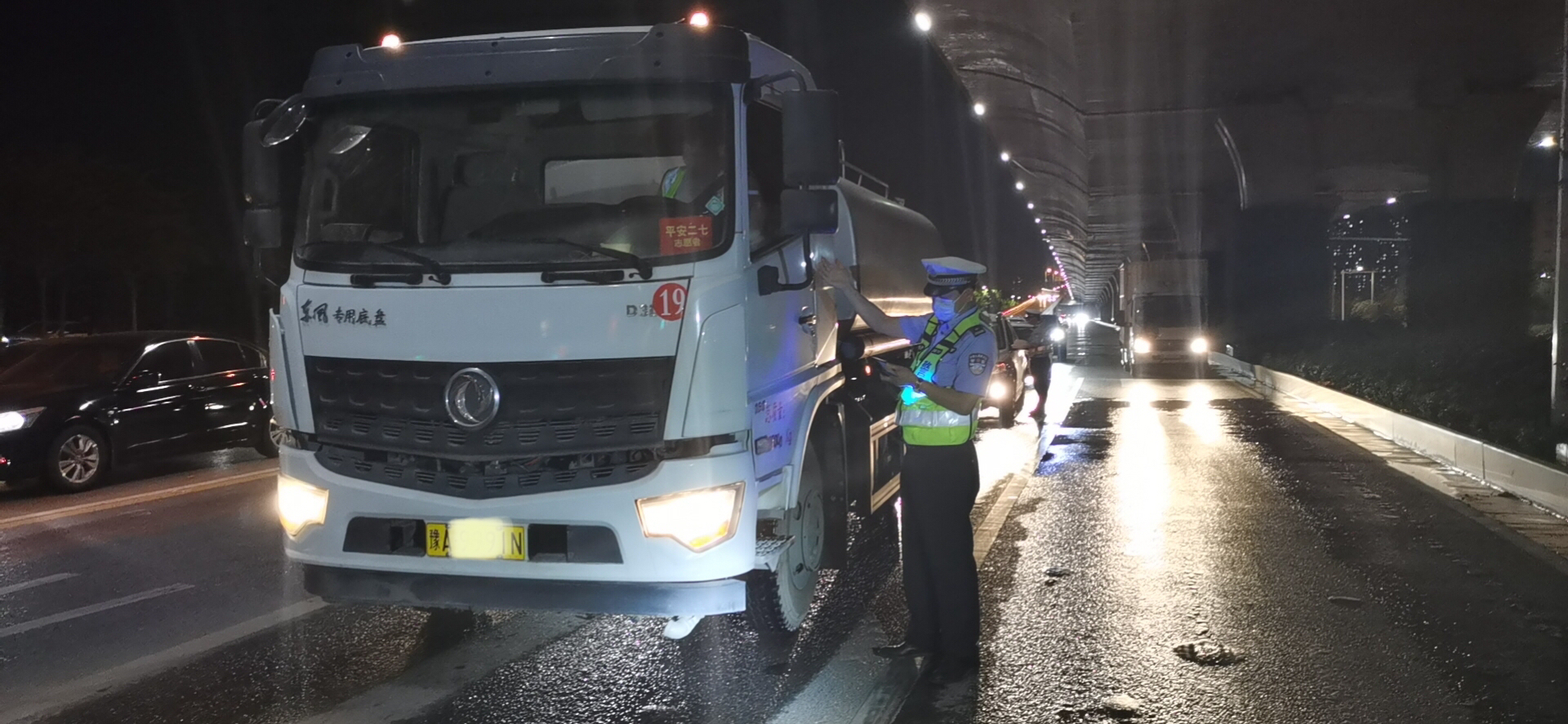 5月26日晚上9时40分,郑州交警二大队一中队民警潘亚文、张少科在西三环长江路口执行夜间集中行动时, 一辆车号为豫A1290Y的水泥罐车向路口驶来,该车左前大灯不亮,存在夜间行车安全隐患。民警将车拦在路边,对驾驶员耿某驾驶机件不符合技术标准的机动车进行了150元罚款的处罚。