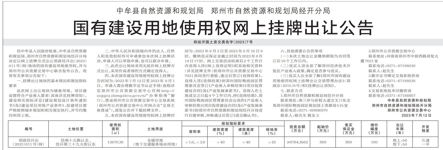 【大河财立方消息】7月12日,中牟县自然资源和规划局、郑州市自然资源和规划局经开分局公告称,决定以网上挂牌方式出让郑政经开出〔2023〕011号(网)地块的国有建设用地使用权。