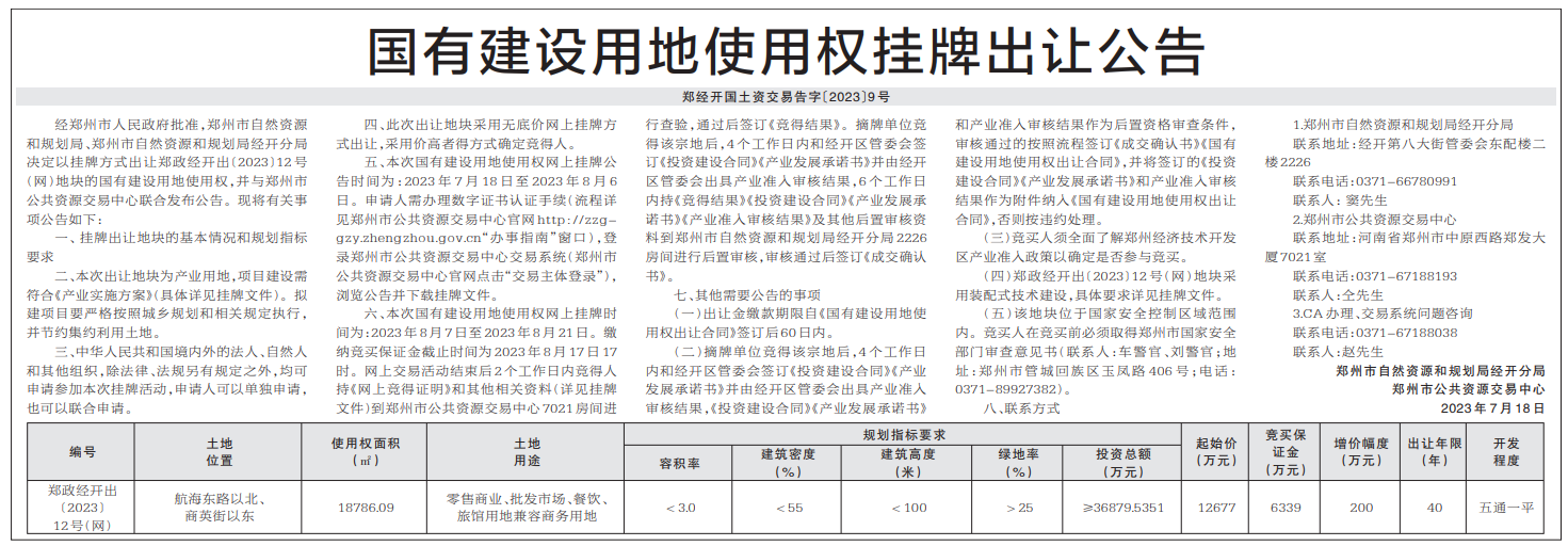 【大河财立方消息】7月18日,郑州市自然资源和规划局、郑州市自然资源和规划局经开分局公告称,决定以挂牌方式出让郑政经开出〔2023〕12号 (网)地块的国有建设用地使用权。