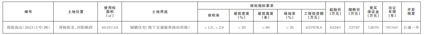 此次出让的郑政高出〔2023〕3号(网)地块位于青杨街北、河阳路西,为合村并城项目用地,使用权面积65187.24平方米(折合约97.78亩),起始价63347万元,工程投资额不低于37476.5万元。本次国有建设用地使用权网上挂牌时间为2023年7月19日至2023年8月2日。