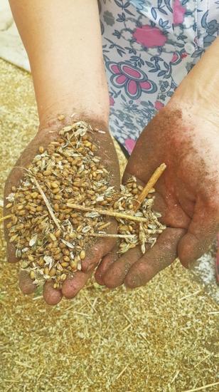 在王银玲家,堆放着新收的10余袋小麦,都是黑乎乎的。“因为是黑色,我们都没有清理小麦,所以里面还混有麦皮,”王银玲边说边用手捧起一捧小麦给记者看:多数小麦的麦尖成了黑色,部分小麦全黑。