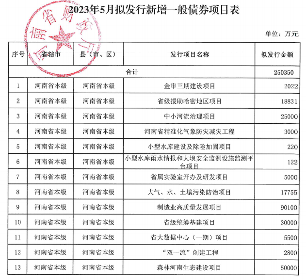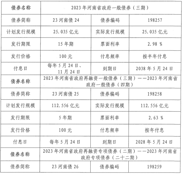 【大河财立方消息】5月23日,据中国债券信息网消息,2023年河南省政府一般债券(三至四期)和专项债券(二十二期)发行结果出炉,河南193.225亿元地方债完成发行。