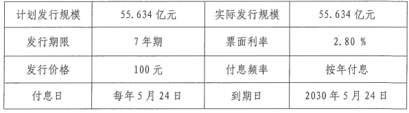 其中,5年期再融资一般债券计划发行112.556亿元,票面利率2.63%;7年期再融资专项债券计划发行55.634亿元,票面利率2.80%;15年期新增一般债券计划发行25.035亿元,票面利率2.98%。