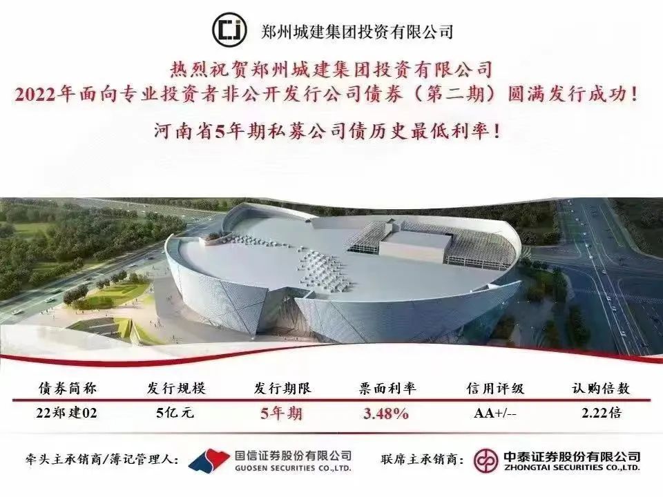该债券简称为“22郑建02”,发行规模5亿元,期限5年,信用评级为AA+/-,发行全场倍数2.22倍,利率为3.48%,创河南省5年期私募公司债历史最低利率。