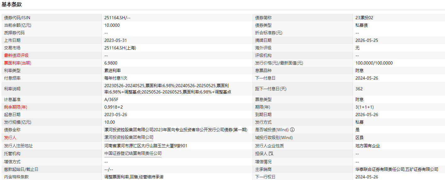 据悉,本期债券简称23漯投02,期限3(1+1+1)年,起息日为2023年5月26日,兑付日为2026年5月26日。债券主承销商为华泰联合证券、五矿证券,募集资金将用于偿还到期公司债券。