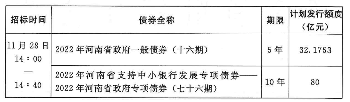 其中,2022年河南省政府一般债券(十六期)为5年期,计划发行额度为32.1763亿元;2022年河南省支持中小银行发展专项债券——2022年河南省政府专项券 (七十六期)为10年期,计划发行额度为80亿元。