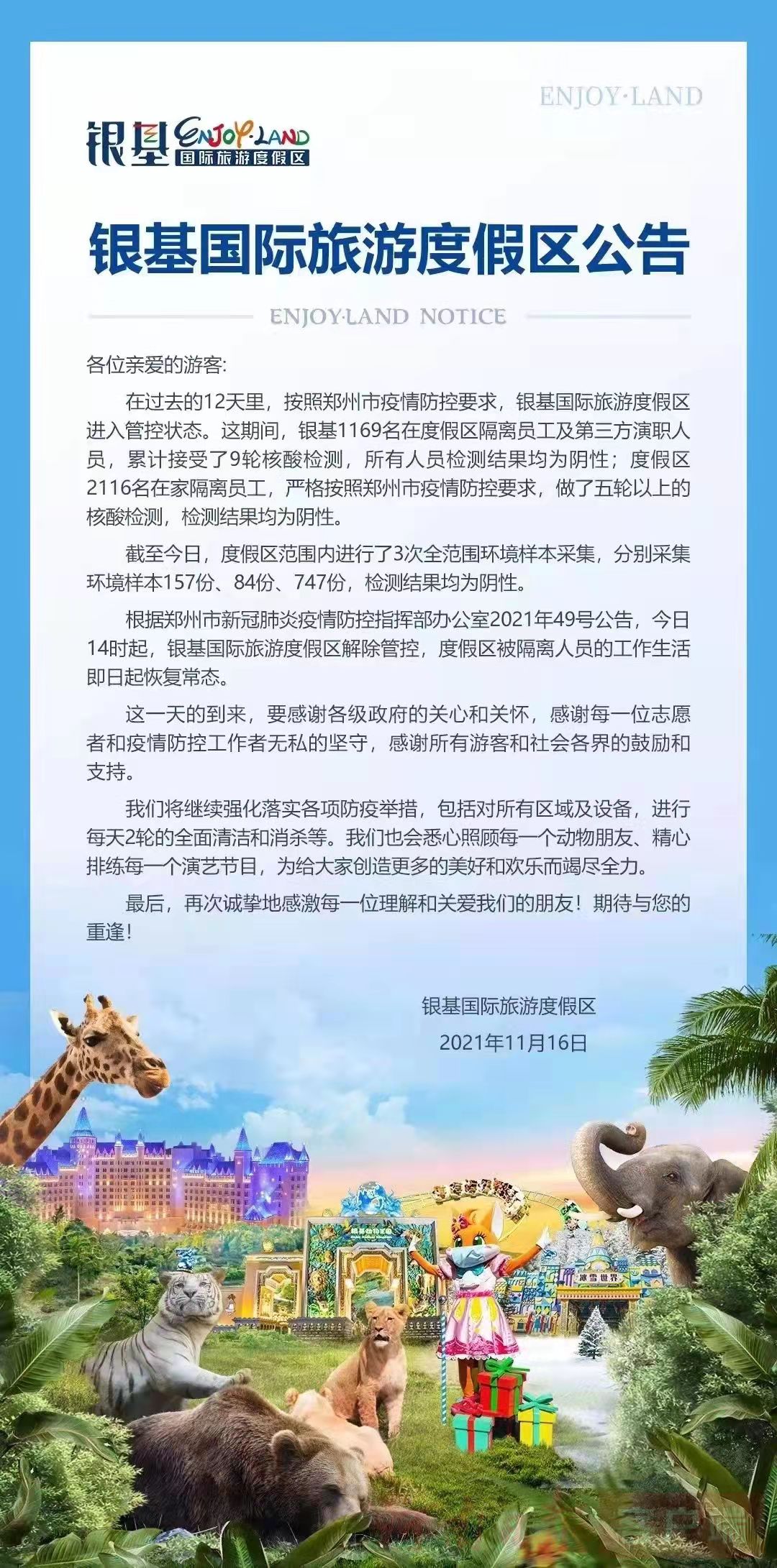 【大河财立方消息】11月16日下午,银基国际旅游度假区发布公告,16日14时起,该度假区解除管控,度假区被隔离员工的工作、生活即将回归常态。当天根据郑州市新冠肺炎疫情防控指挥部办公室2021年49号通告,相关区域解除了管控。