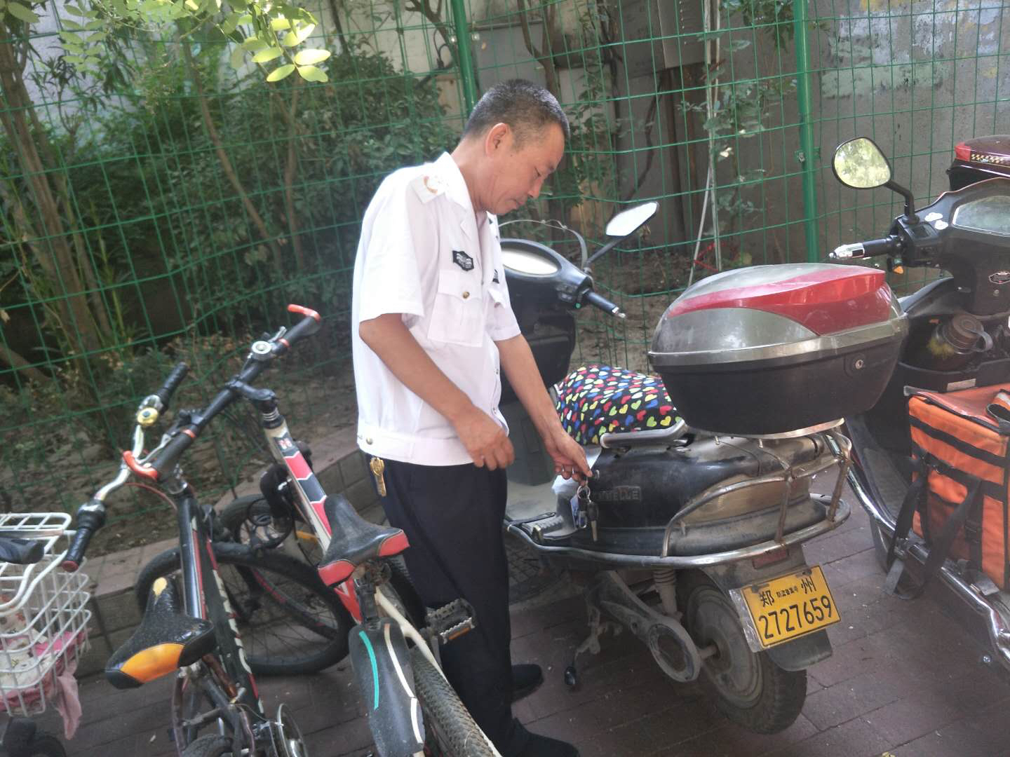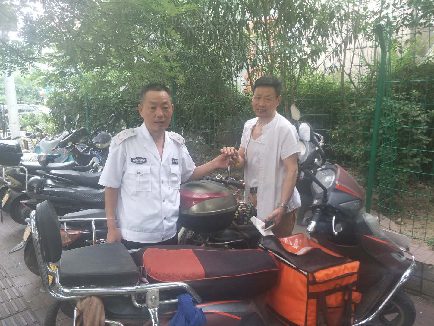 7月3日下午3时30分,郑州市金水区文化路街道办事处巡防队员朱正海、冯郑齐,在经五路上整治乱停乱放的电动车时,发现一辆电动车上插着一串钥匙,忙问附近商户是谁的车,却没人知道。队员在附近等了20多分钟,没见车主过来。为不影响巡逻,队员便在车上留了一张纸条,上面写上联系方式后,将车钥匙拔下来带走。