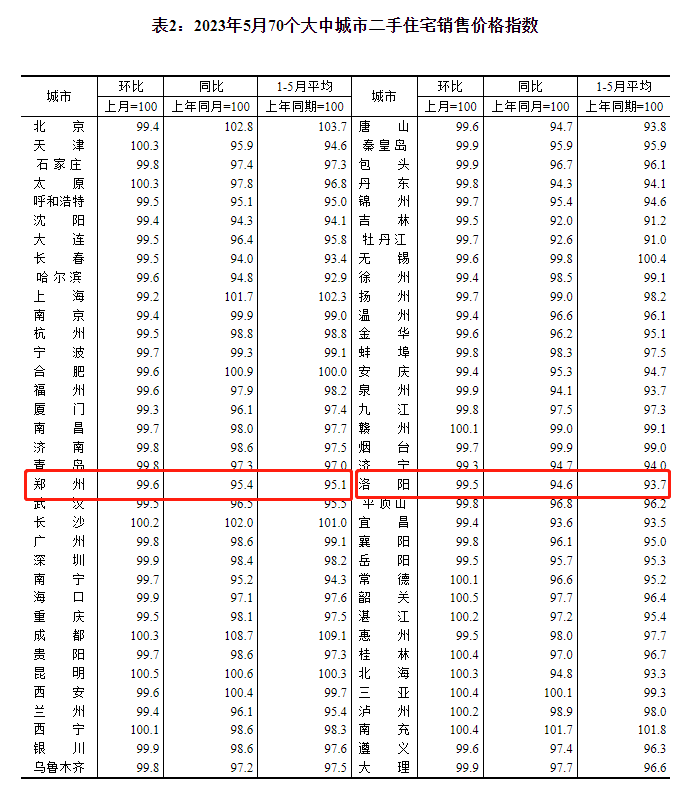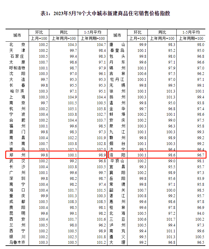 5月份,郑州市新建商品住宅销售价格环比下降0.2%,同比增长0.1%;洛阳市新建商品住宅销售价格环比增长0.1%,同比下降1.4%。