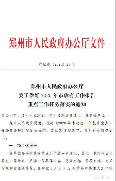 大河财立方消息 5月28日,郑州市人民政府办公厅发布关于做好2020年市政府工作报告重点工作任务落实的通知。