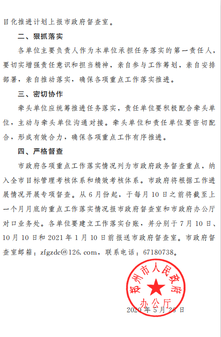 通知显示,市政府各项重点工作落实情况列为市政府政务督查重点,纳入全市目标管理考核体系和绩效考核体系。市政府将根据工作进展情况开展专项督查。从6月份起,于每月10日之前将截至上一个月月底的重点工作落实情况报市政府督查室和市政府办公厅对口业务处。各单位要建立工作落实台账,并分别于7月10日、10月10日和2021年1月10日前报送市政府督查室。