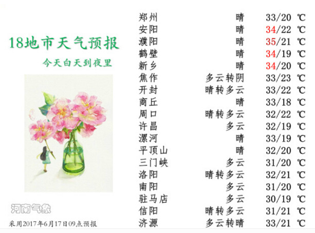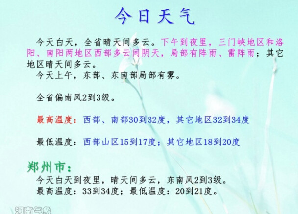 17日夜里,三门峡地区和洛阳、南阳两地区西部多云间阴天,局部有阵雨、雷阵雨。今天夜里,三门峡地区和洛阳、南阳两地区西部多云间阴天,局部有阵雨、雷阵雨;其它地区晴天间多云。