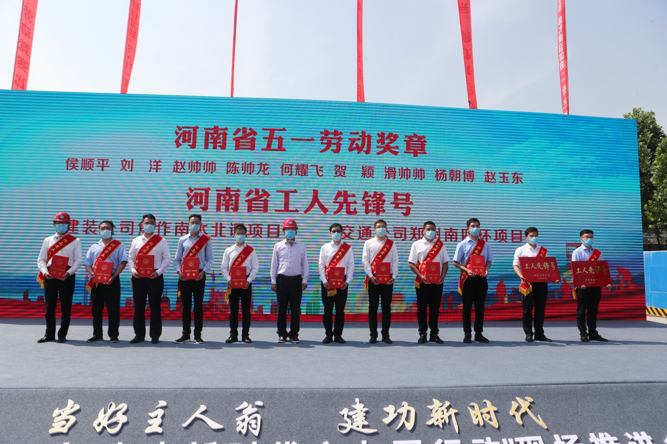 活动现场,寇武江为中建七局荣获河南省“五一劳动奖章”和“工人先锋号”代表颁奖,并向辛勤奋斗在施工一线的重点工程建设者表示慰问和感谢。他表示,全省上下正齐心协力赶进度、争时间、保安全、促发展,广大职工要进一步发扬劳模精神、劳动精神、工匠精神,持续擦亮工人先锋号、劳模工匠创新工作室等品牌,用加倍的干劲、闯劲、钻劲创先争优,为谱写新时代中原更加出彩绚丽篇章作出新的更大贡献。
