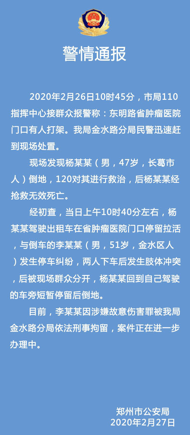 2月27日,郑州市公安局发布警情通报,2月26日上午,在省肿瘤医院门口,一出租车司机与他人因停车纠纷发生肢体冲突后倒地身亡。发生纠纷的另一方,因涉嫌故意伤害罪被警方刑拘。